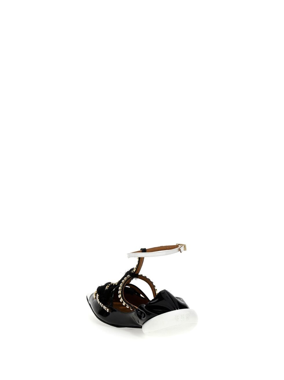 Tootsy’ ballet flats in polished leather with contrast toe cap and heel tab, crystal appliques, satin nodes, ankle straps, leather and rubber soles.