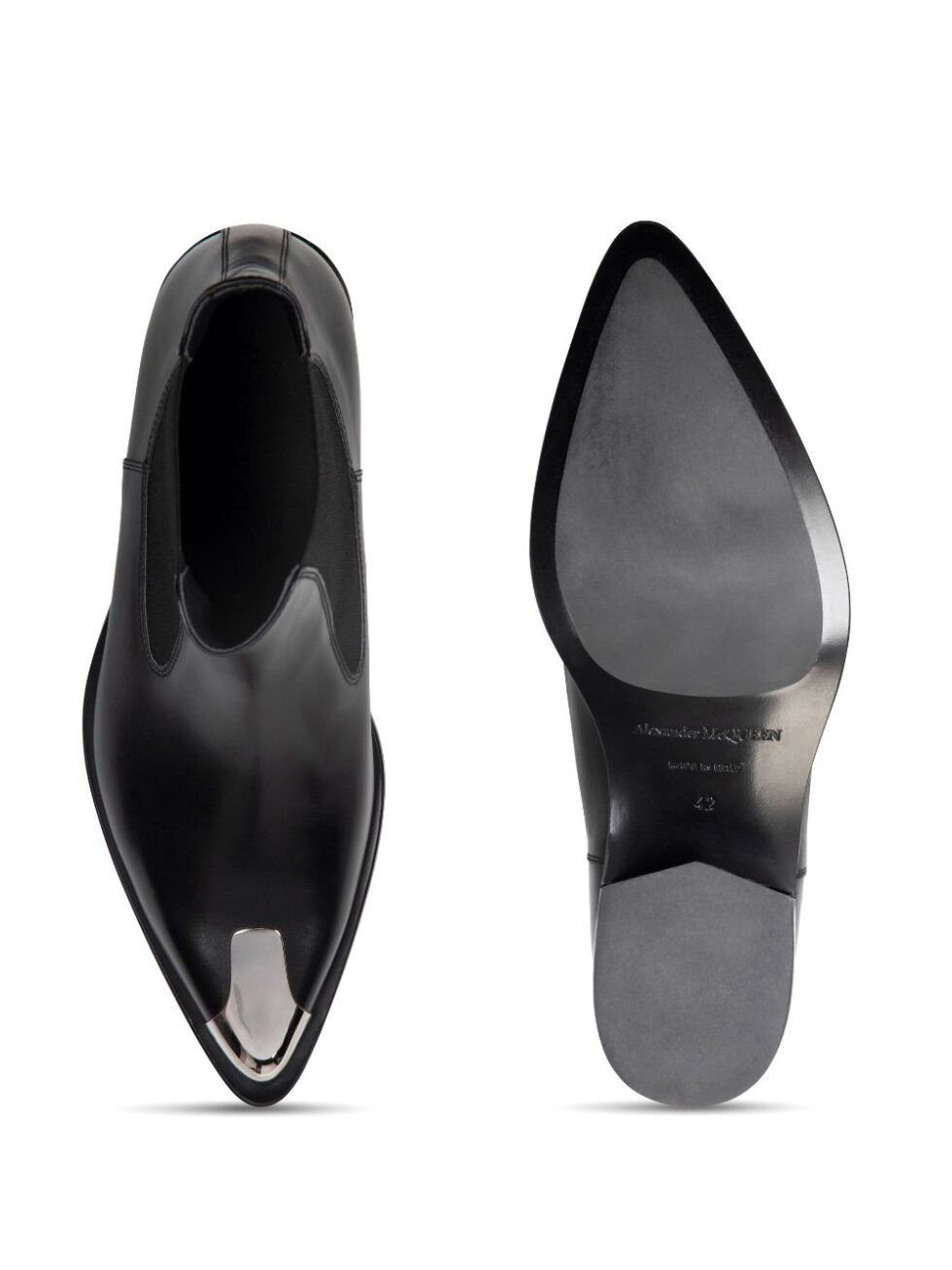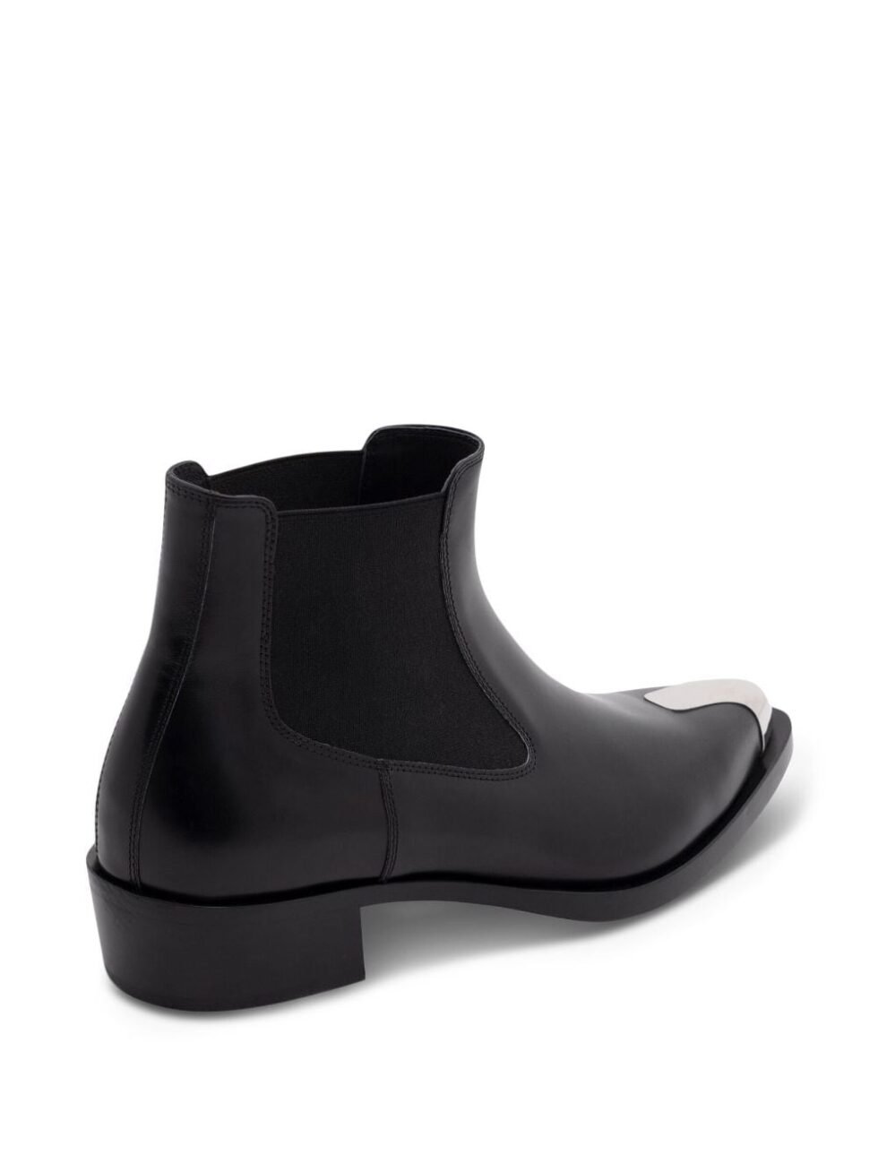 Punk Chelsea leather boots from Alexander McQueen featuring black, stretch-design, logo at the sole, ankle-length, silver-tone hardware, pointed toe, low block heel and Cuban heel.