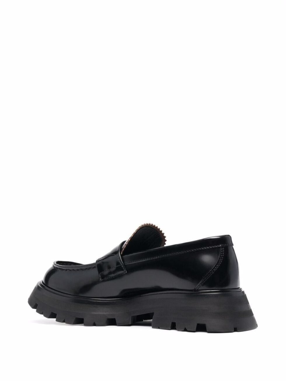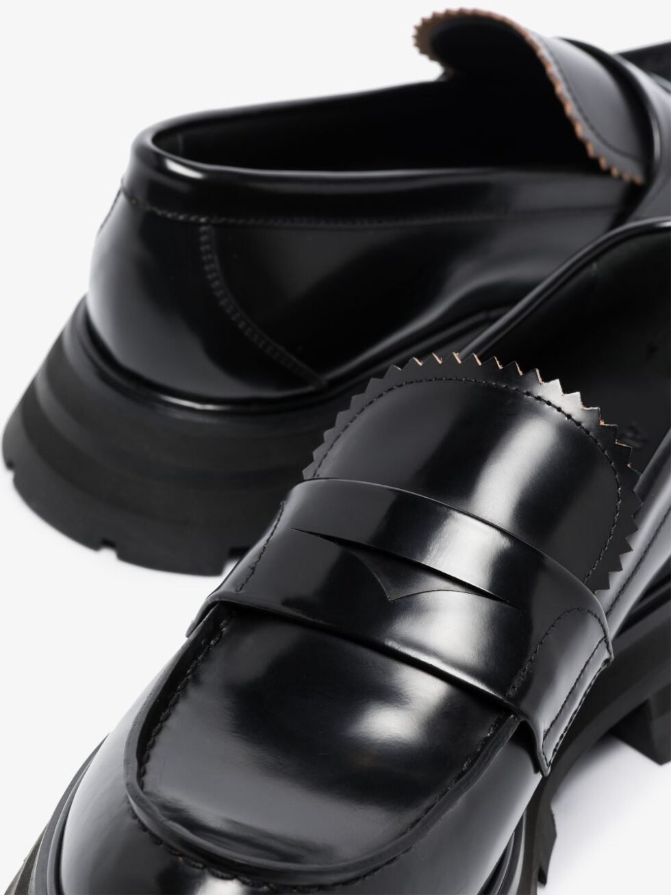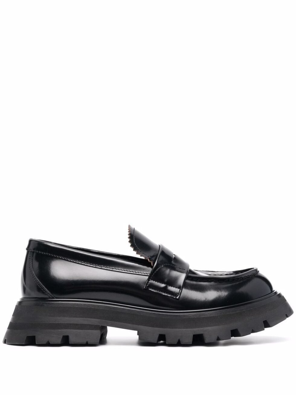 Black calf leather Wander leather loafers from Alexander McQueen featuring penny slot, scallop edge, branded insole, round toe, slip-on style and chunky rubber sole.
