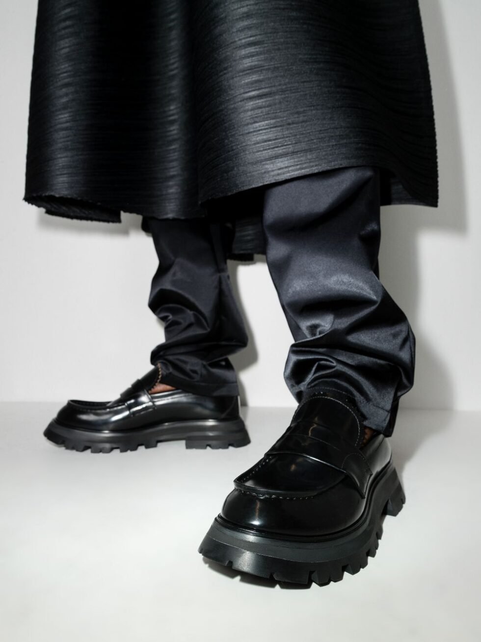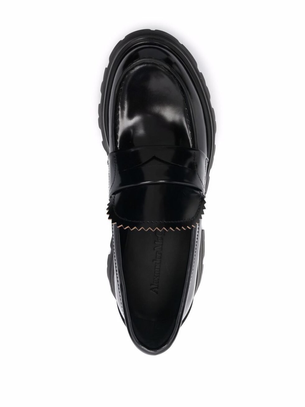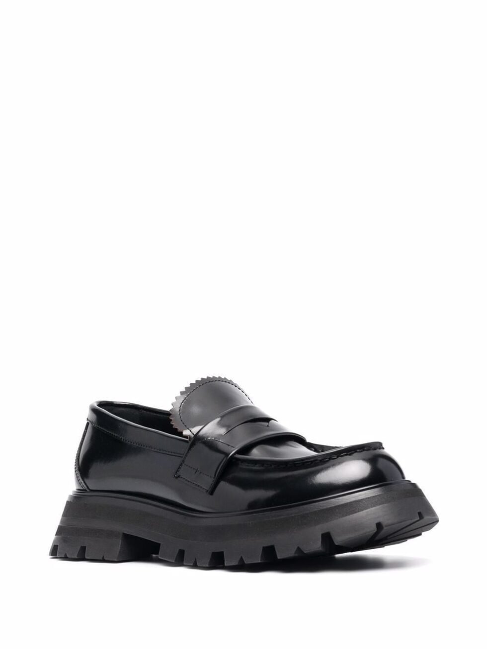 Black calf leather Wander leather loafers from Alexander McQueen featuring penny slot, scallop edge, branded insole, round toe, slip-on style and chunky rubber sole.