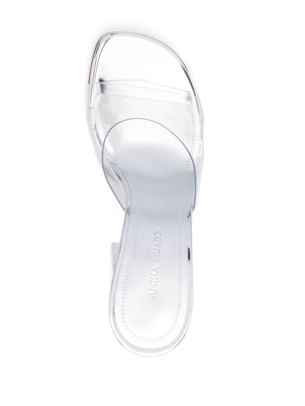 silver-tone transparent design calf leather open toe open back branded footbed 100mm high block heel slip-on style