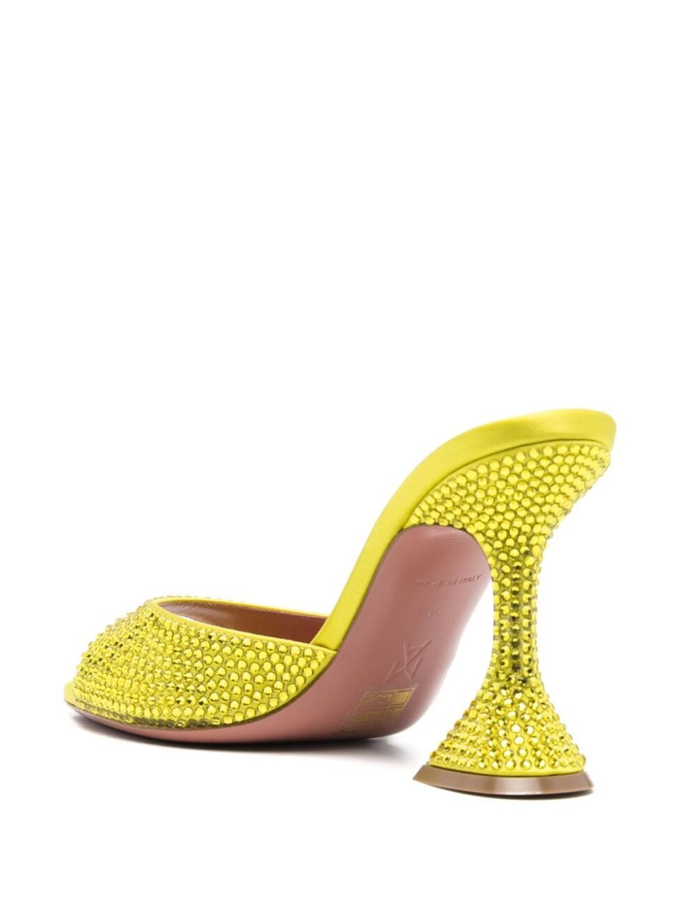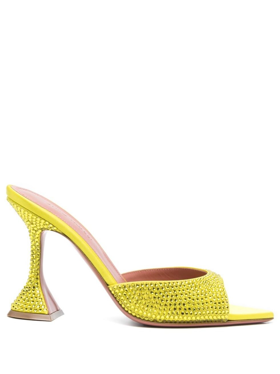 Caroline 95mm crystal-embellished mules from AMINA MUADDI featuring lemon yellow, silk satin, crystal embellishment, pointed toe, open toe, single toe strap, slip-on style, sculpted heel, branded leather insole and leather outsole.