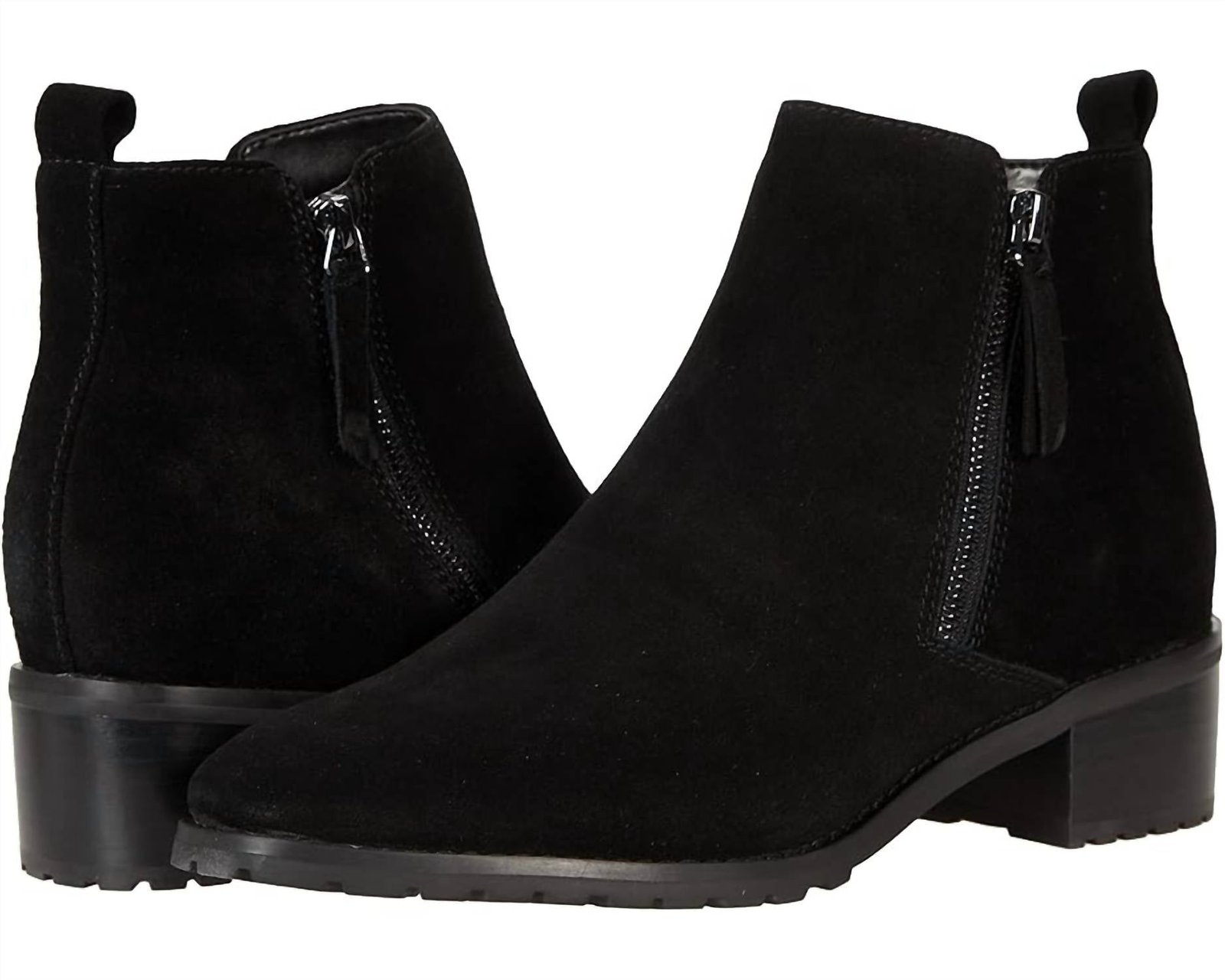 Say hello to the perfect, most versatile boot. The ankle height makes this style easily transition from day to night. Wear them with your favorite skinny jeans and tee for a more laid back look, or pair them with your favorite mini dress and jacket for a night out on the town.Step out in style with the Blondo? Women’s Samara Waterproof Bootie, crafted in luxurious black suede for a sleek look. Featuring dual side zipper closures, these booties ensure a snug fit while the pull loop allows easy on/off. These ankle boots have a low block heel and AquaProtect? sealed seams to keep your feet dry and comfortable in all weather. With a heel height of 2 inches and a weight of 1 lb, they’re imported and designed with a man-made upper, lining, insole, and outsole.