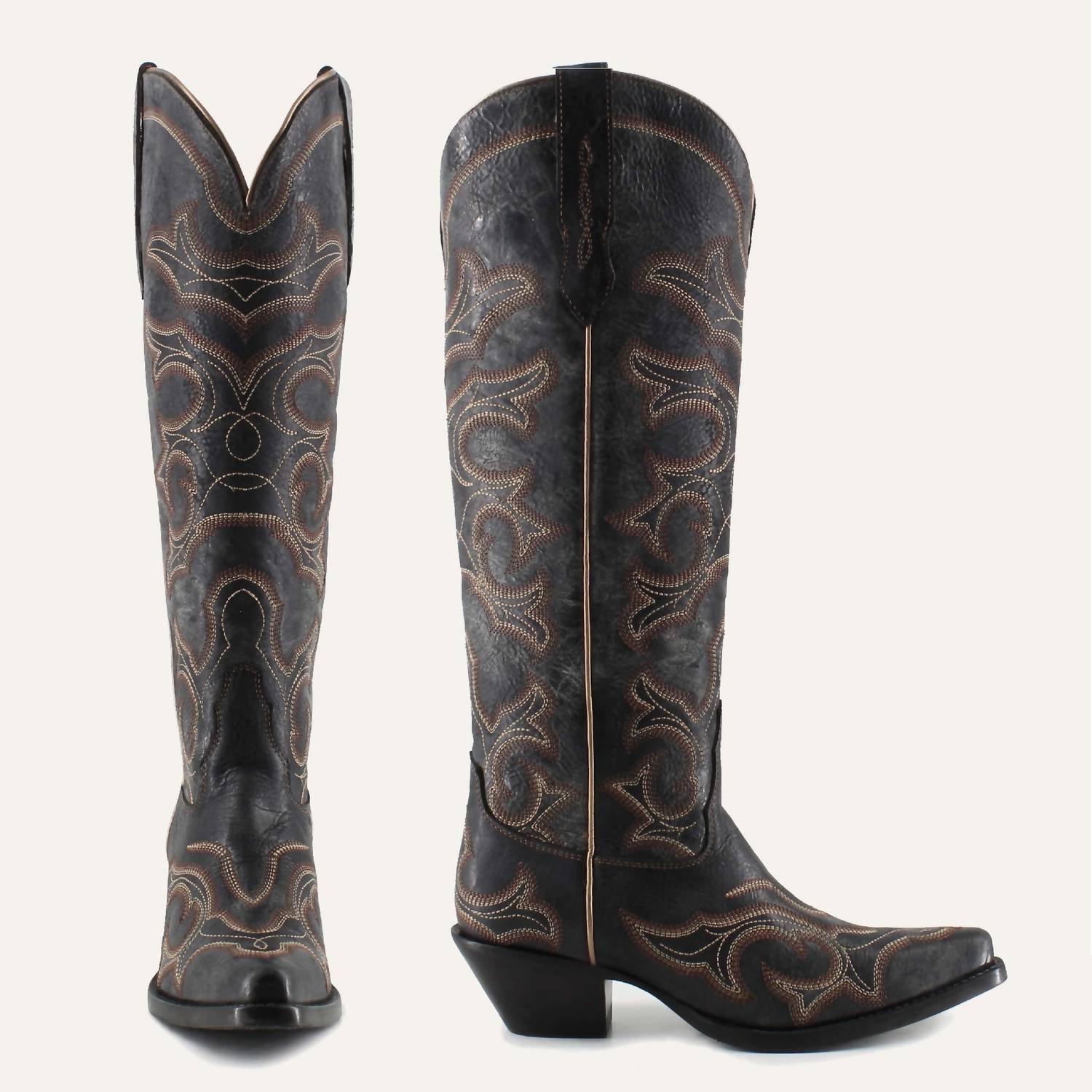A stylish boot with a comfortable fit and the perfect amount of height. These classic boots are the perfect addition to any outfit and can be worn season after season.Step into sophistication with the Olivia Leather Cowgirl Boots by Buck & Brana, designed to elevate your western-inspired ensemble. This vintage-inspired tall boot in classic black showcases intricate western stitching and a weathered finish, perfectly paired with a pointed toe for a touch of elegance. Featuring a bold block heel, these boots are ideal for music festivals or any summer occasion where you want to make a statement. Crafted for adult women, they effortlessly blend traditional allure with modern style.
