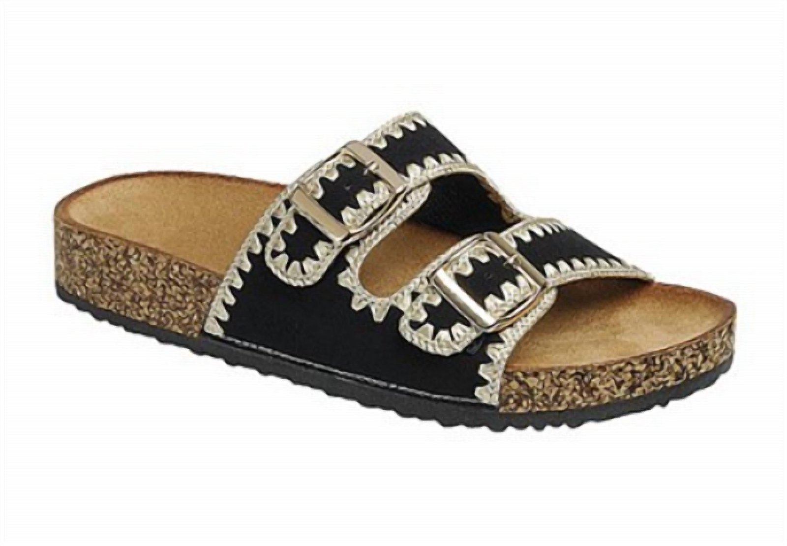 This sandal will take you from brunch to dinner and everything in between.Designed with a boho chic flair. Featuring a double-strapped slip-on design. Boast unique blanket stitching and an adjustable metallic buckle for a customized fit. Open toe and platform heel rest atop a durable PVC outsole with a cork pattern wrapped for an added touch of luxury. Perfect for travel, black faux PU leather sandals offer both style and comfort with a flat heel.