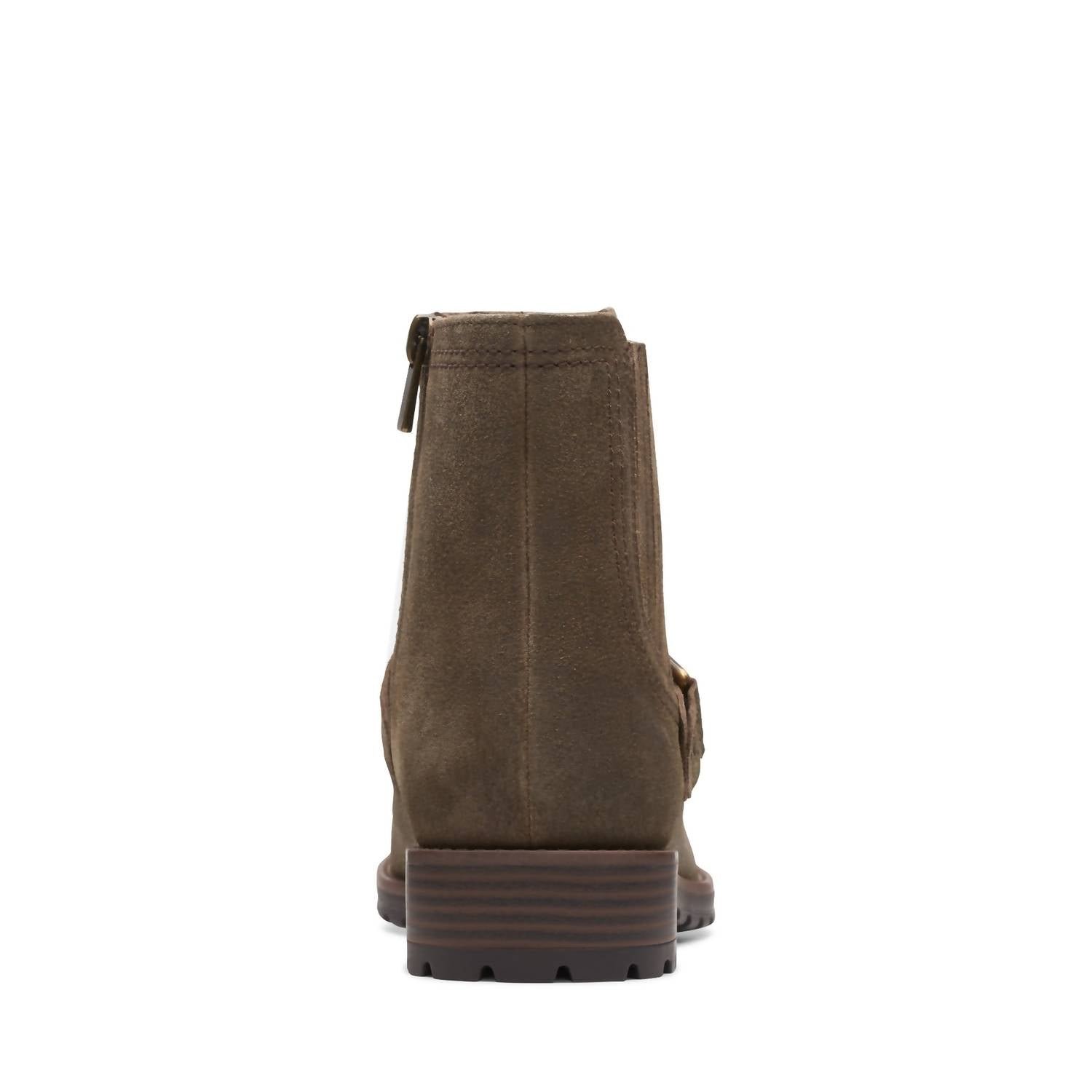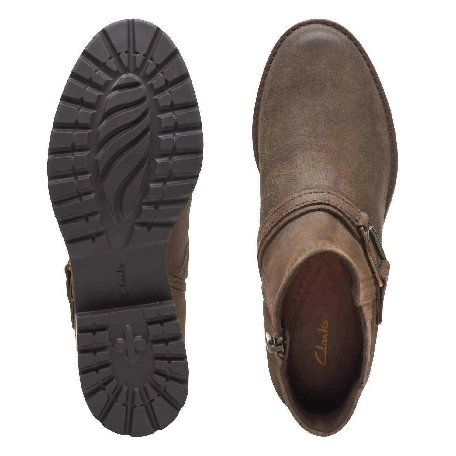 Say hello to the perfect, most versatile boot. The ankle height makes this style easily transition from day to night. Wear them with your favorite skinny jeans and tee for a more laid back look, or pair them with your favorite mini dress and jacket for a night out on the town.Step confidently through city streets with the Women’s Aspra Buckle Ankle Boot by Clarks, crafted in dark olive suede for an elegant seasonal look. This design features a practical zip closure and a round toe shape, ensuring comfort and style. It boasts a suede upper, supported by a durable rubber outsole, and a cushioned foam footbed for all-day comfort. The standout buckle detail adds a sophisticated touch, with a heel height of 30mm.