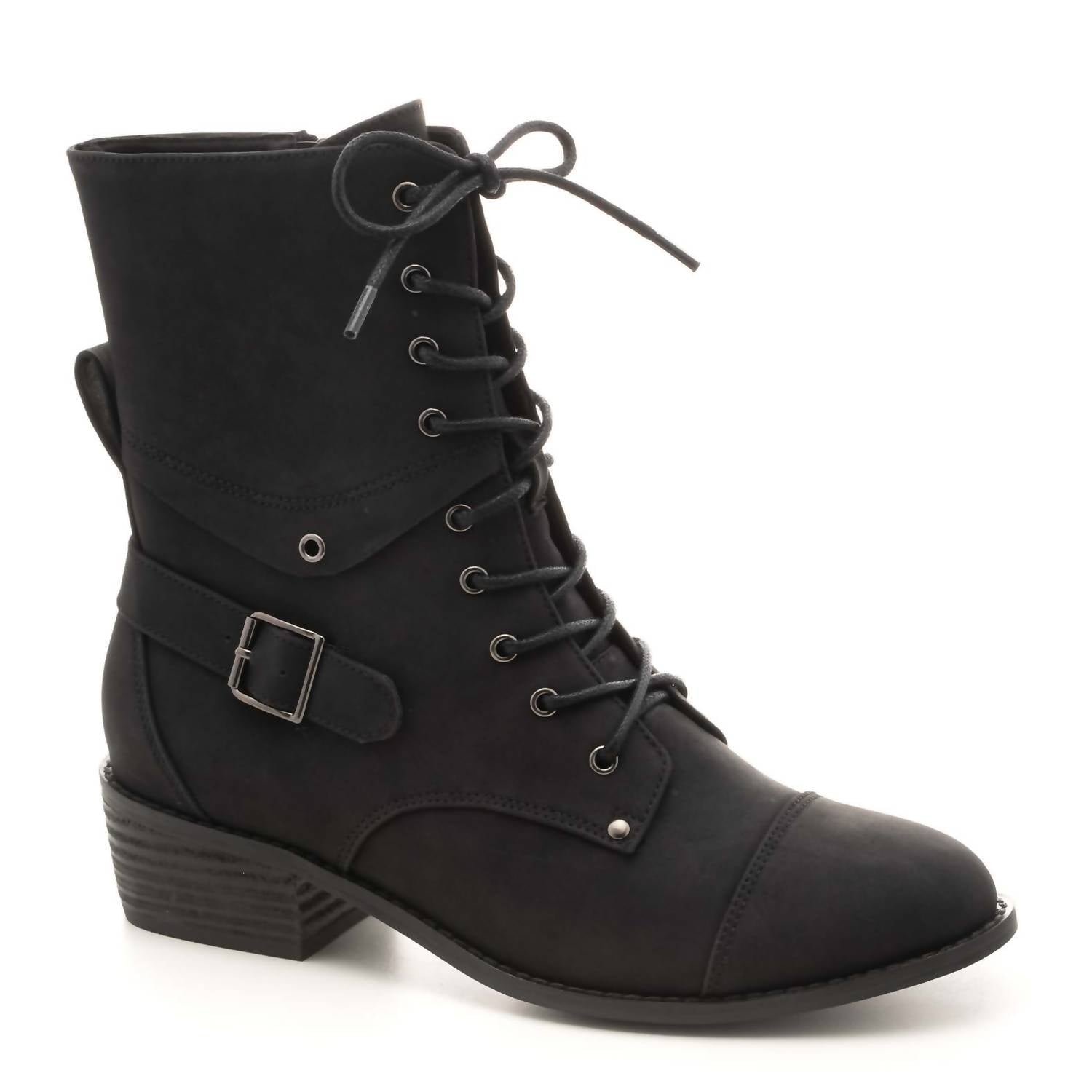 Say hello to the perfect, most versatile boot. The ankle height makes this style easily transition from day to night. Wear them with your favorite skinny jeans and tee for a more laid back look, or pair them with your favorite mini dress and jacket for a night out on the town.Step into autumn with the Women’s Hocus Pocus Boots by Corkys Footwear, featuring a comfortable 9.5′ shaft and a low 1.25′ block heel. Crafted from soft, black faux leather, these ankle boots offer both style and practicality with a lace-up design, side zip closure, and ankle buckle accent. The included Corky’s marshmallow insole ensures exceptional comfort with every step. Designed to fit true to size, these boots are a chic addition to your fall wardrobe.