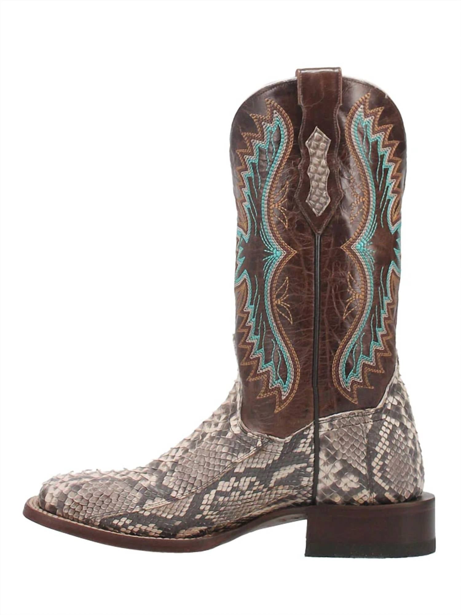 Say hello to the perfect, most versatile boot. The ankle height makes this style easily transition from day to night. Wear them with your favorite skinny jeans and tee for a more laid back look, or pair them with your favorite mini dress and jacket for a night out on the town.Step into the spotlight with the Women’s Python Exotic Stockman Boot by Dan Post, offering a genuine natural python leather foot paired with a deep brown upper. Crafted with an 11′ height and leather lining, this boot features a broad square toe and a leather outsole for durability. The tall fashion and Stockman heels add a touch of Western flair, complemented by a multi-row wing stitch pattern that highlights the rich brown leather. Enhanced by a removable Soft Strike Orthotic, these boots deliver both style and comfort.
