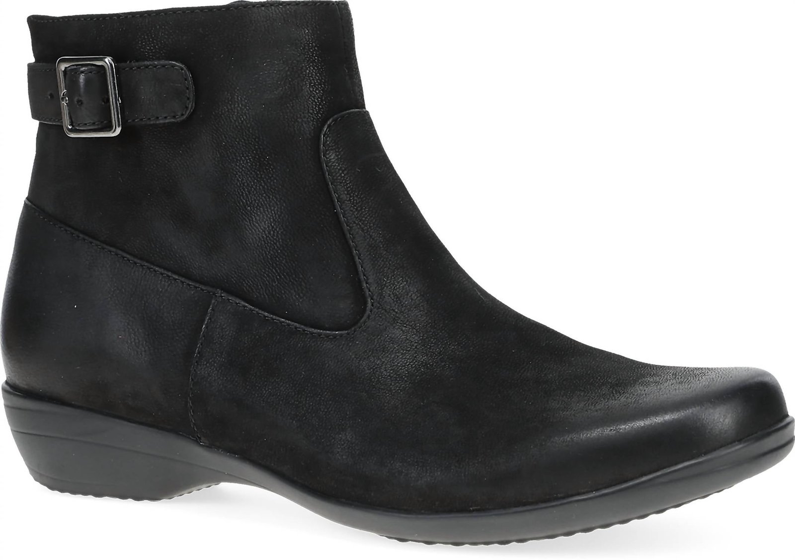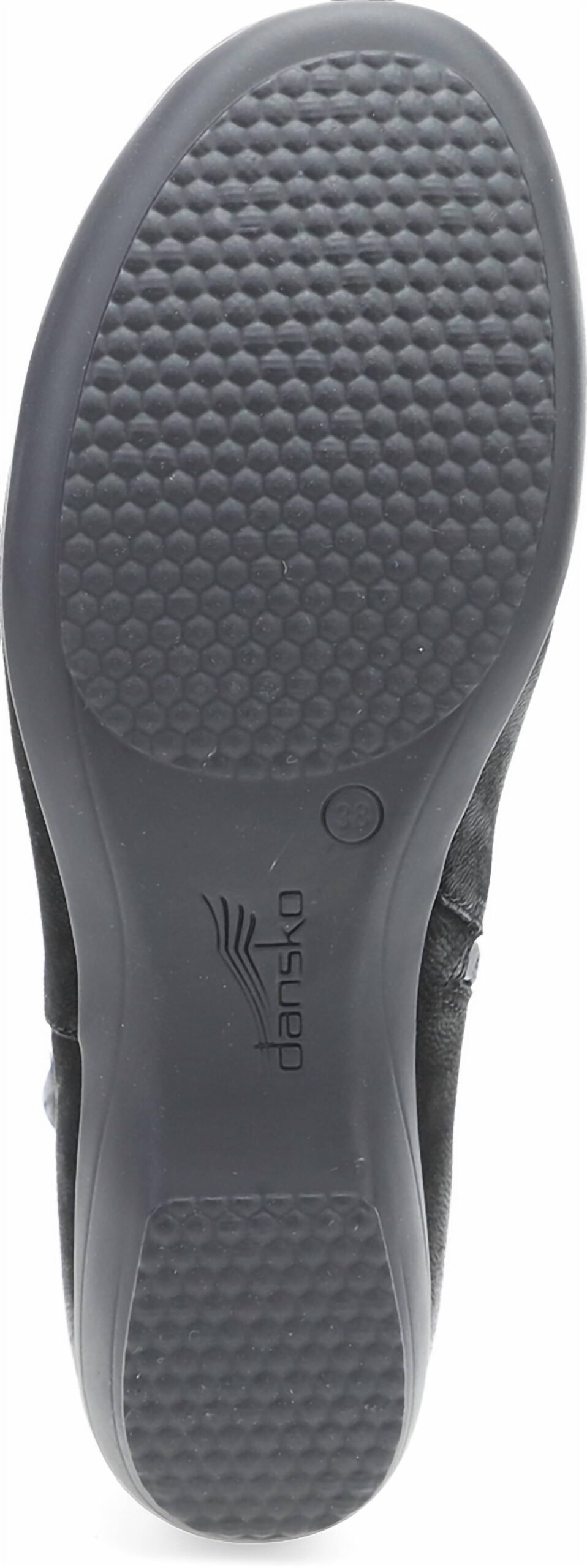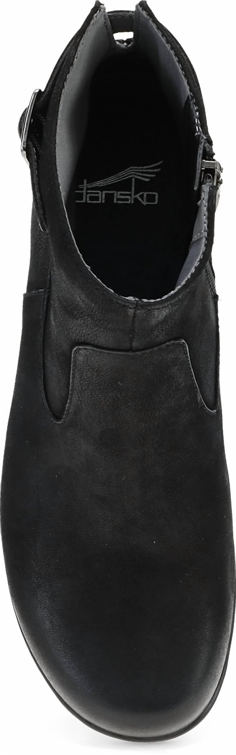 Say hello to the perfect, most versatile boot. The ankle height makes this style easily transition from day to night. Wear them with your favorite skinny jeans and tee for a more laid back look, or pair them with your favorite mini dress and jacket for a night out on the town.Step into comfort and style with the Women’s Finnley Burnished Nubuck ankle boots by Dansko in timeless black. Featuring a flattering round toe and flat heel, these boots are perfect for a fall dinner party. Designed with the adult woman in mind, these booties effortlessly blend sophistication with practicality. A versatile addition to any wardrobe.