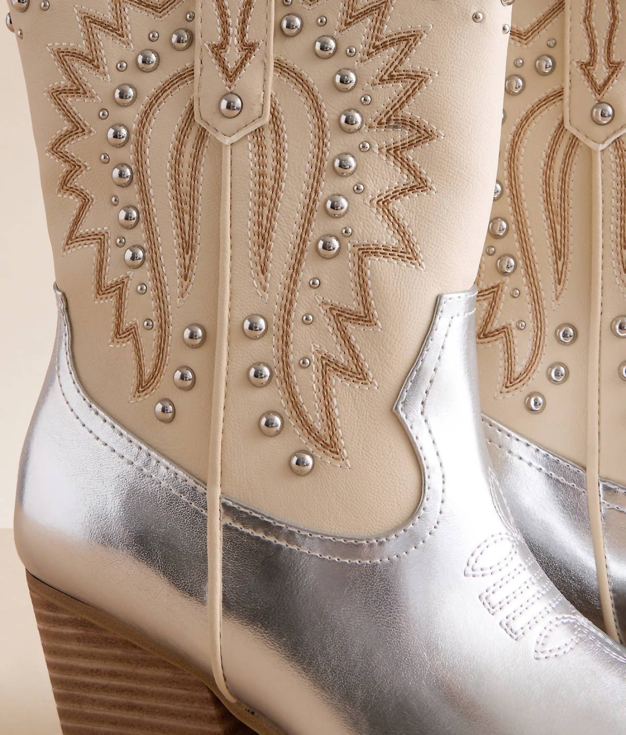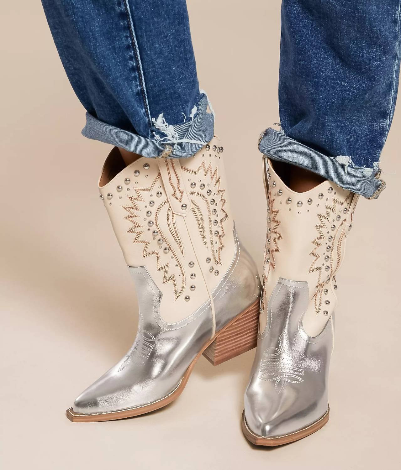 Step out in confidence and showcase your impeccable taste with these fashionable and versatile boots. Their classic style will have you reaching for these boots season after season.Step into style with the Women’s Moonlight Boot by Dolce Vita, designed to make a statement. Crafted from metallic faux leather in a striking silver and cream colorway, these boots feature intricate embroidery and studded accents. With a mid heel height of 2.5 inches and a 9-inch shaft, these pointed-toe booties offer both comfort and elegance with a cushioned footbed and block heel design. Perfect for dinner parties and summer events, elevate your wardrobe effortlessly with this western-inspired staple.