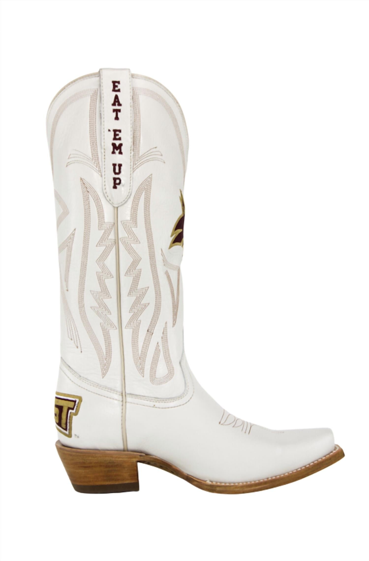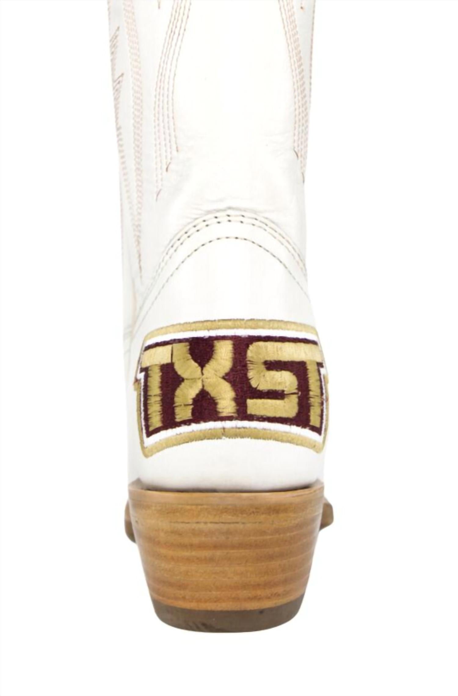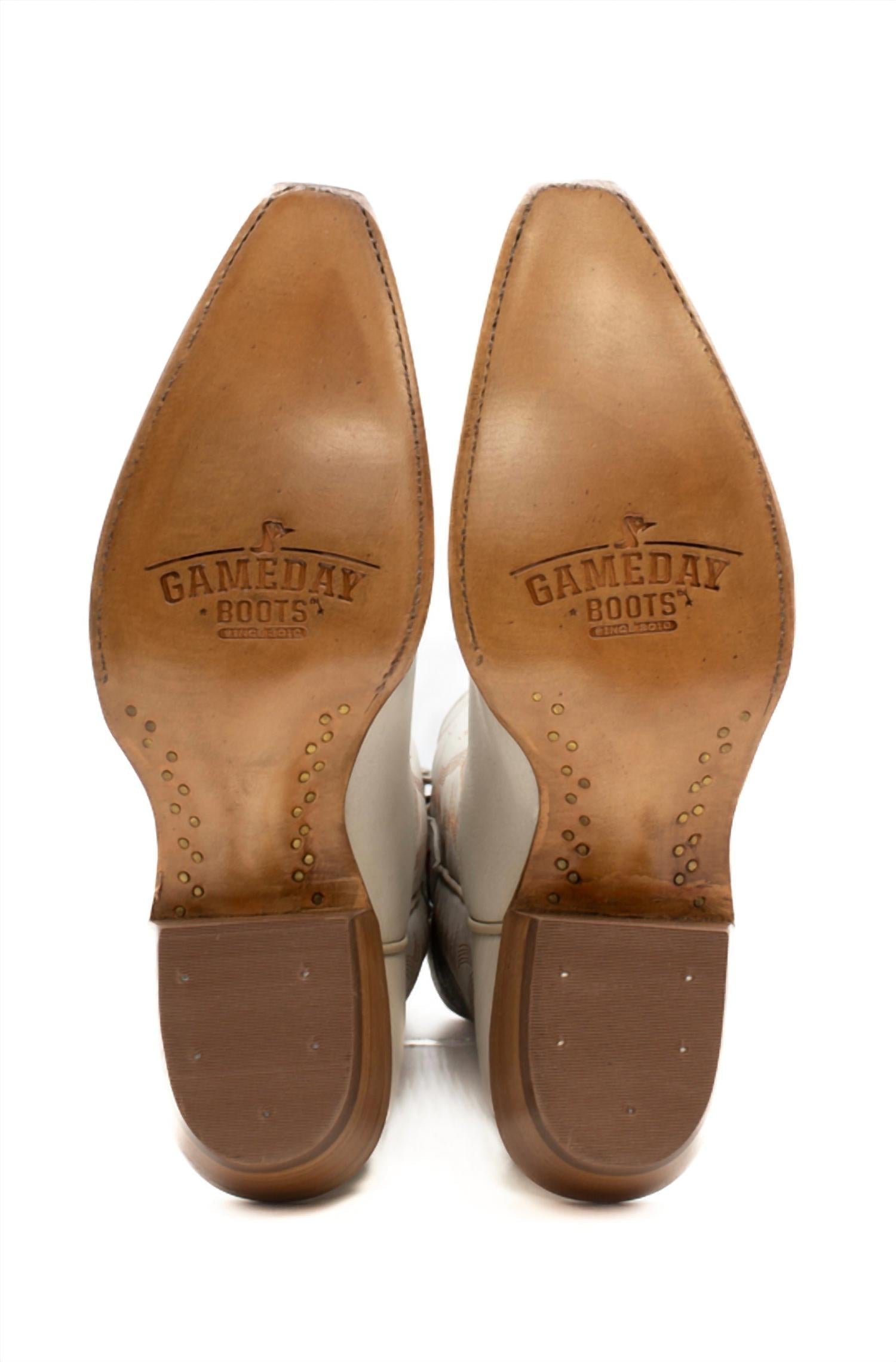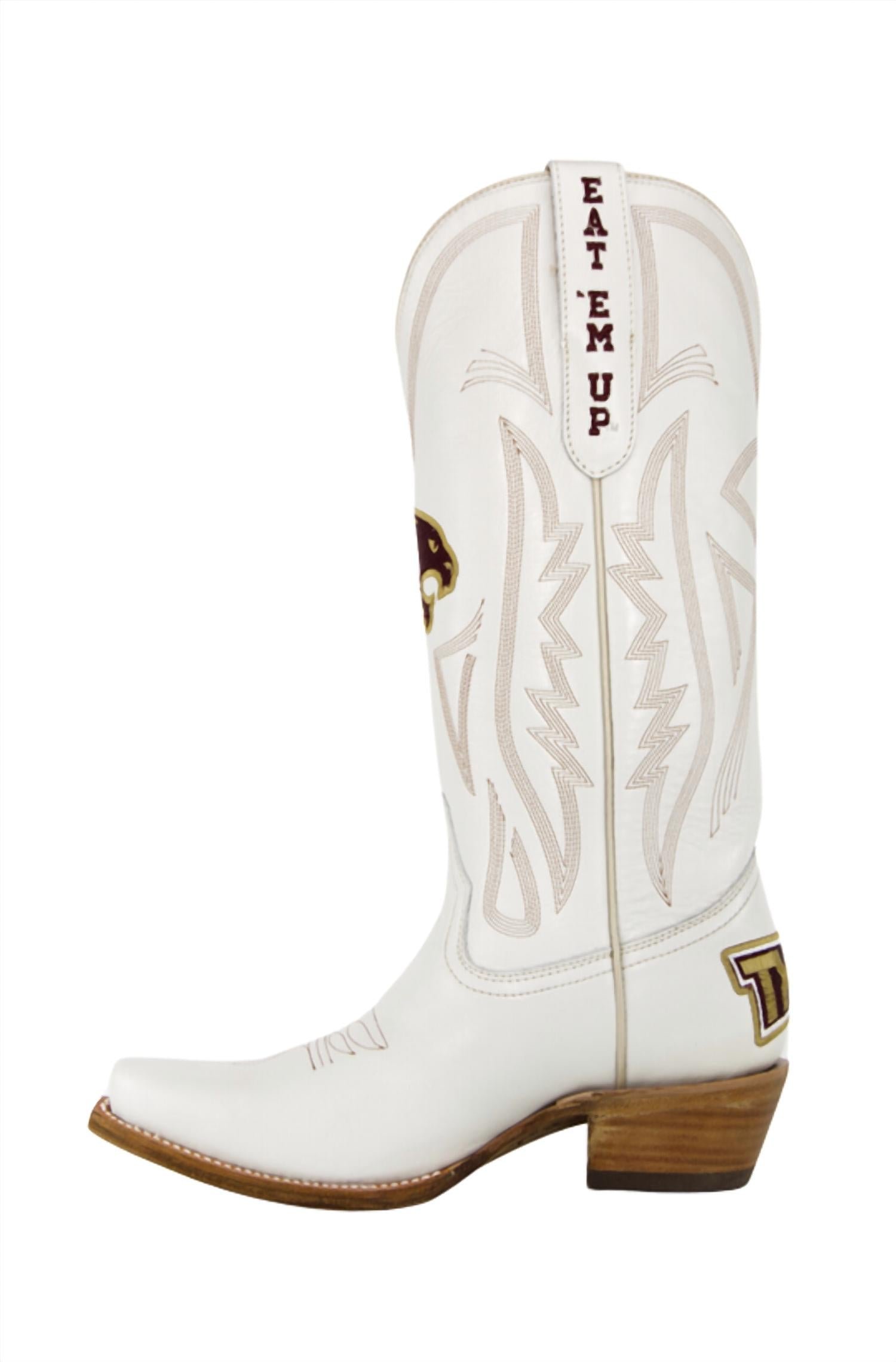 Upgrade your shoe game with these classic heeled boots, designed to merge sophistication and style. Comfortable enough for long days or a night out on the town.Step up your game with the Women’s Western Texas State Bobcats Boots by Gameday Boots, crafted for style and comfort. These premium heeled boots are made of genuine ivory leather and feature Goodyear Welt construction for lasting durability. Enjoy the ultracomfort memory foam insole and smooth leather lining, paired with a natural stacked wood block heel and a traditional snip-toe profile. Handcrafted in Mexico and designed for holiday parties during the spring season, these boots stand out with multiple embroidered team logos and classic western stitching.