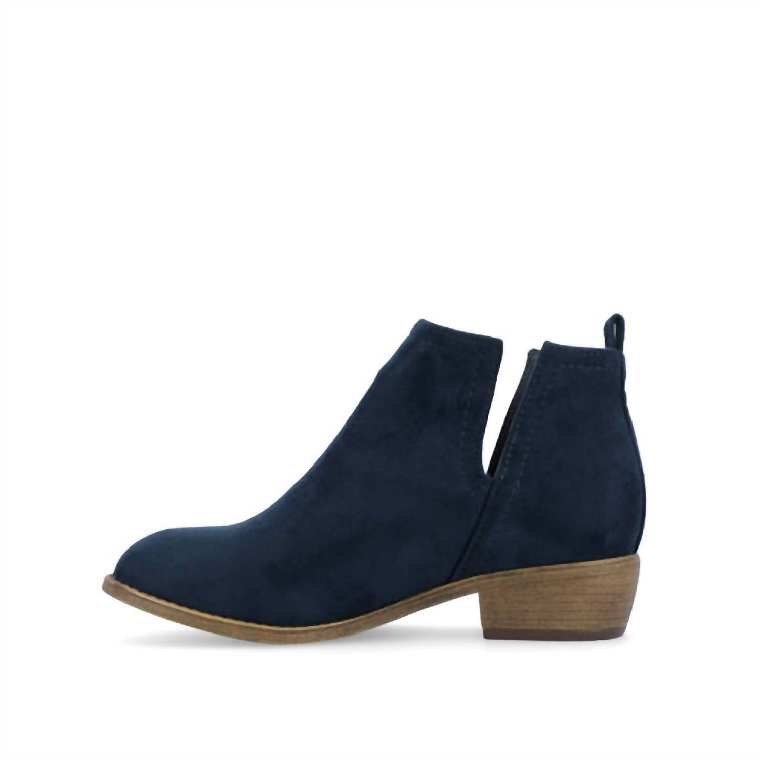 Say hello to the perfect, most versatile boot. The ankle height makes this style easily transition from day to night. Wear them with your favorite skinny jeans and tee for a more laid back look, or pair them with your favorite mini dress and jacket for a night out on the town.Step into chic sophistication with the Women’s Regular and Wide Width Rimi Bootie by Journee Collection. Crafted in blue faux suede, these ankle booties boast a stylish side split design and a comfortable padded footbed. They feature a 1 1/2-inch stacked block heel and a medium shoe width for a snug fit. The pull-on closure pairs effortlessly with a round toe style, while a 5-inch shaft height and 9-inch top circumference complete the look. Lined with fabric and crafted with a man-made outer sole, they promise both comfort and durability.
