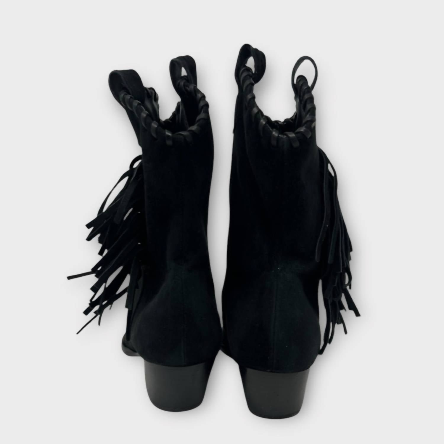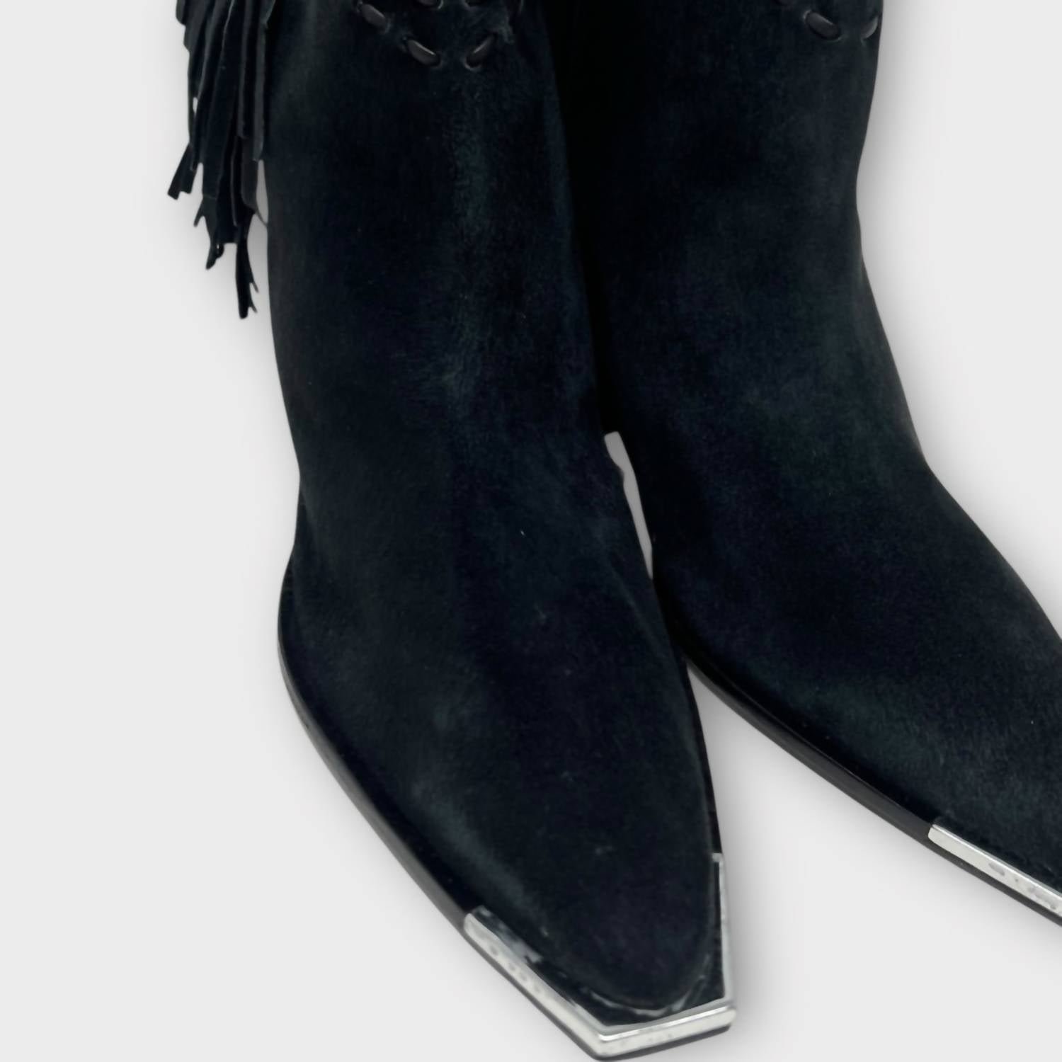 Say hello to the perfect, most versatile boot. The ankle height makes this style easily transition from day to night. Wear them with your favorite skinny jeans and tee for a more laid back look, or pair them with your favorite mini dress and jacket for a night out on the town.Invoke your inner Western spirit with the Women’s Alexxa Suede Western Bootie by SCHUTZ, crafted in trendy Fringe Black suede. This bootie stands out with fringe trim and tonal hipstitching, enhancing its old-town charm. Featuring a practical block heel at 1.5 inches and a 7-inch shaft, these shoes deliver both style and comfort with a leather upper, synthetic lining, and leather sole, all made in Brazil. Perfect for concerts or a fall wardrobe refresh, these ankle boots embody the Western trend in a modern, squared-toe design.
