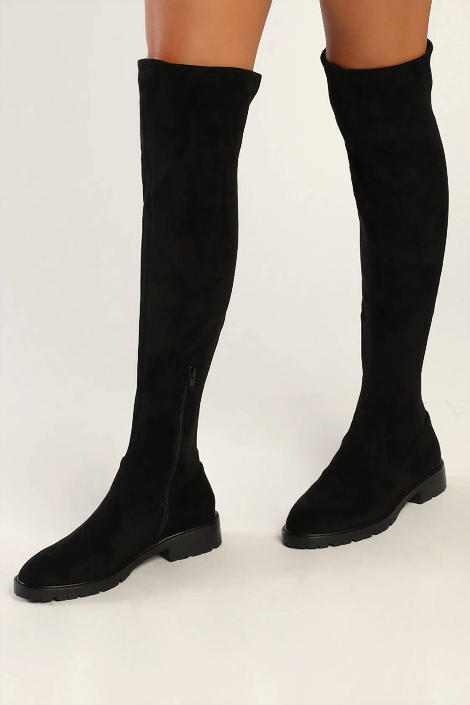 These stylish over the knee boots will look great with denim, dresses or skirts. You can’t go wrong!Experience understated elegance with the Lizbeth Over-the-knee Boots by STEVE MADDEN, crafted in luxurious black suede. Featuring a minimalist design, these boots are perfect for the fall season and the back-to-school occasion. Designed with a round toe and a flat heel height of 1 1/4′, they offer both style and comfort. Ideal for Thanksgiving gatherings, these boots embody a timeless appeal for the modern woman.